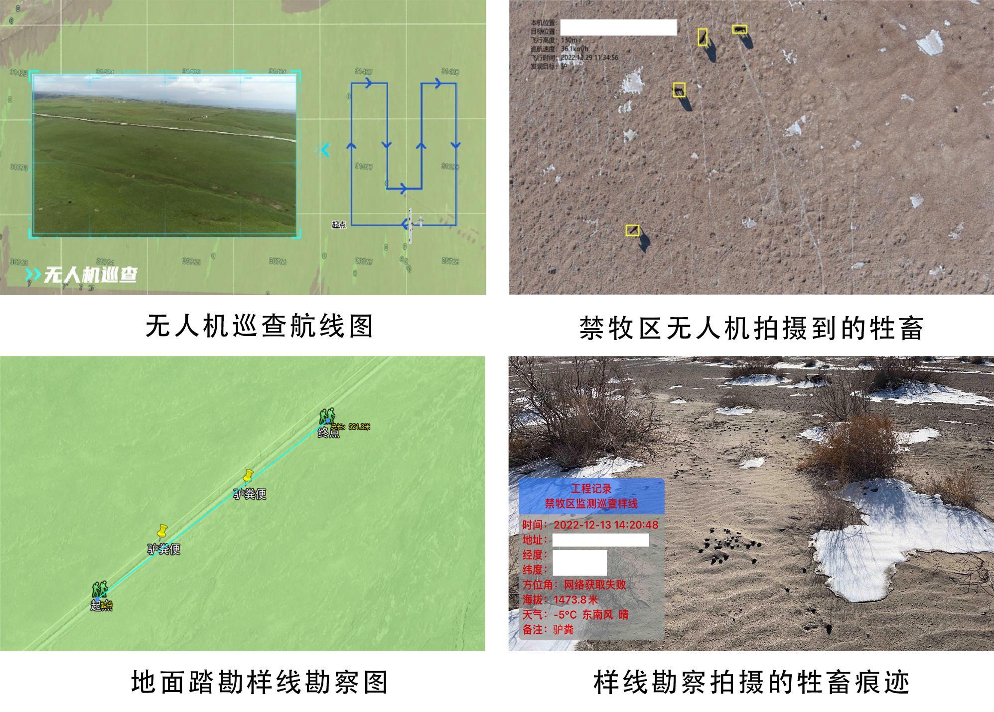采用“空中+地面”一体化的巡查手段,以无人机巡检为主,配合地面调查,勘察草原禁牧区放牧情况。根据作业区域地形、面积、气候等情况综合判断选择设备的类型,通过预设的无人机飞行航线,无人机搭载30倍变焦可见光云台在飞行过程中对重点、隐蔽区域进行清晰捕捉,完成超视距、高精度影像的实时传输。同时沿无人机作业航迹方向徒步进行实地勘察,利用经纬度相机软件对勘察过程中发现的牧畜痕迹问题进行拍照取证。